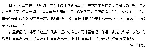 公司喜獲“計(jì)量保證確認(rèn)證書”