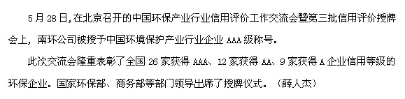 南環(huán)公司榮獲中國環(huán)保產(chǎn)業(yè)行業(yè)企業(yè)信用等級評價AAA級稱號