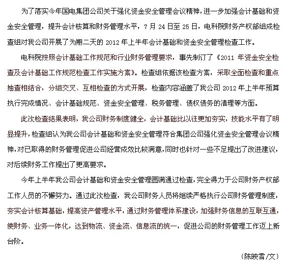 我公司通過2012年上半年會(huì)計(jì)基礎(chǔ)和資金安全管理檢查