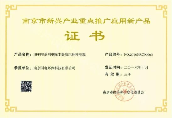 近日,我公司兩項產(chǎn)品,“HFPPS系列電除塵器高壓脈沖電源”及“超低排放氣態(tài)污染物檢測儀器”榮獲南京市經(jīng)濟和信息化委員會頒發(fā)的《南京市新興產(chǎn)業(yè)重點推廣應(yīng)用新產(chǎn)品證書》。