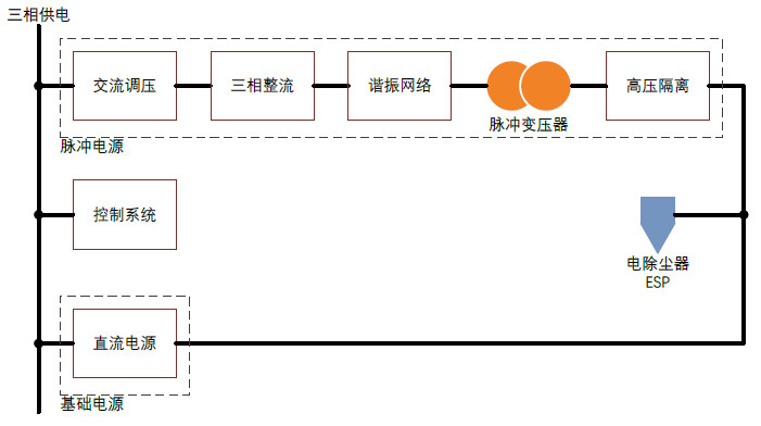 脈沖電源采用間歇供電方式,其供電時間短且采用能量回饋機制。脈沖源負責粉塵荷電,而基礎(chǔ)電源只需維持電除塵器電場起暈電壓,提高了電能利用效率,在滿足除塵效率的同時減少了供電功率。