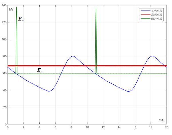 基礎(chǔ)源的輸出電壓一般在60kV~80kV,脈沖源的電壓脈沖高達80kV,兩者疊加合成后,在瞬間形成一個高達140kV的高壓脈沖供給電除塵器電場,其峰值電壓遠高于電除塵器在使用常規(guī)電源供電時的擊穿電壓。