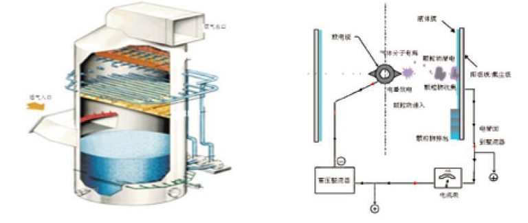 濕式電除塵器采用靜電吸附收塵原理,在陰陽極間加上高壓電場。當(dāng)含塵煙氣流經(jīng)電場的過程中,水分子和粉塵粒子被荷電,塵、霧粒子在電場庫侖力的作用下向陽極移動(dòng)到達(dá)陽極板后,在集塵極表面形成一層均勻的水膜,在水膜作用下可依靠重力自流向下而與氣體分離。與傳統(tǒng)電除塵器相比,濕式電除塵器陰陽極清灰均不采用機(jī)械振打,而是采用靠靜電吸附水霧對陰陽極進(jìn)行清理,或者通過噴淋系統(tǒng)進(jìn)行定時(shí)沖洗。