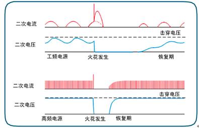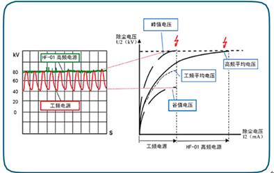 與工頻電源相比,高頻電源的供電電流由一系列窄脈沖構(gòu)成,其脈沖寬度、幅度及頻率均可以調(diào)整,根據(jù)不同工況提供最合適的電壓波形,提高除塵效率,控制方式靈活形。間歇供電時,可有效抑制反電暈現(xiàn)象,特別適用于高比電阻粉塵工況。