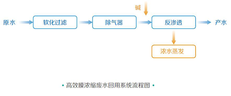 廢水首先通過(guò)化學(xué)加藥軟化,之后進(jìn)入離子交換除硬單元去除殘留硬度,再通過(guò)除氣器脫除二氧化碳。除氣器出水進(jìn)入反滲透濃縮單元,系統(tǒng)在堿性條件下運(yùn)行,濃水側(cè)TDS可濃縮到100000mg/L以上。