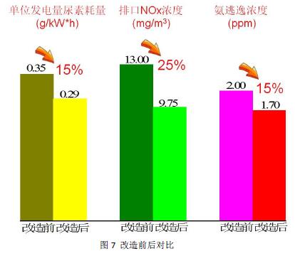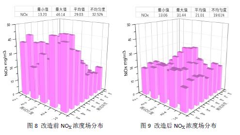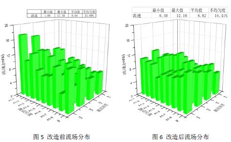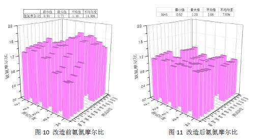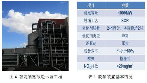 圖4為某電廠1000MW機(jī)組智能噴氨改造示范工程,脫硝裝置的基本情況見表1。為了評(píng)估智能噴氨改造的效果,分別對(duì)比了改造前后的流場(chǎng)分布、單位發(fā)電量尿素耗量、排口NOX濃度、氨逃逸、脫硝出口NOX不均勻度、氨氮摩爾比等。