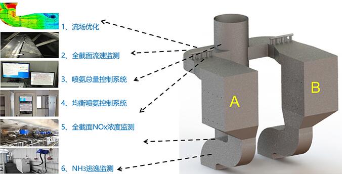 目前,對(duì)于絕大部分燃煤電廠的噴氨控制,主要存在流場(chǎng)和NOX濃度場(chǎng)分布不均、無(wú)法實(shí)現(xiàn)分區(qū)域噴氨、噴氨控制無(wú)法及時(shí)響應(yīng)工況變化等三個(gè)方面的問題。為了實(shí)現(xiàn)智能噴氨,必須對(duì)流場(chǎng)進(jìn)行優(yōu)化,采用更科學(xué)的全截面監(jiān)測(cè)方法,更先進(jìn)的控制策略和更精準(zhǔn)的控制模型,對(duì)噴氨總量和各個(gè)支路的噴氨量進(jìn)行控制,實(shí)現(xiàn)分區(qū)域精細(xì)化噴氨。