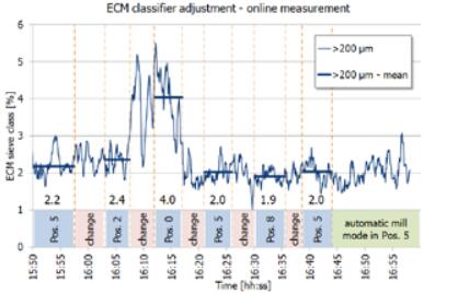 有了煤粉細(xì)度分析儀以后,就能實(shí)時優(yōu)化煤粉細(xì)度,從而改善燃燒并降低飛灰含碳量。采用磨煤機(jī)的分離器可以調(diào)節(jié)煤粉的細(xì)度。在調(diào)節(jié)和檢測煤粉細(xì)度時,要用煤粉細(xì)度分析儀進(jìn)行連續(xù)測量,由此很容易獲得最優(yōu)的磨煤機(jī)設(shè)定值。右圖的測量結(jié)果說明煤粉細(xì)度儀具有高度的重復(fù)性和準(zhǔn)確度。